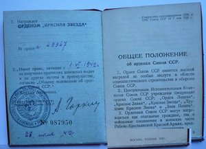 Орденская книжка 1 типа, Гознак 1941 года, на орден Красной Звезды, награжднен офицер пограничник. К ней еще более 10 других документов. Книжка в отличном состоянии. Остальные документы (60 лет ВС подпись председателя КГБ, можно посмотреть здесь: http://auction-su.com/704967,auction_id,auction_details