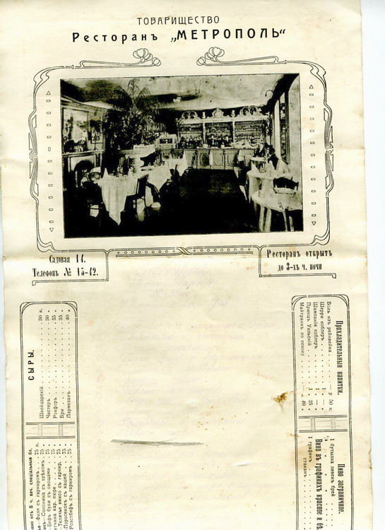 Бланк меню "Ресторанъ Метрополь" с прейскурантом вин боецъ - 15 апр 2010 14:25.54 × Мини профиль пользователя боецъ Сообщения: 2835 Зарегистрирован: 03 фев 2006 10:30.22 Откуда: Московская область Статус: Не в сети - 15 апр 2010 14:25.54 #2123561 Бланк несколько длиннее формата А4, поэтому нижний край в сканер не влез.Предложите. Фото "А я знаю, что в ящиках. Там- нитки! Все спекулянты нитками торгуют!" (с)