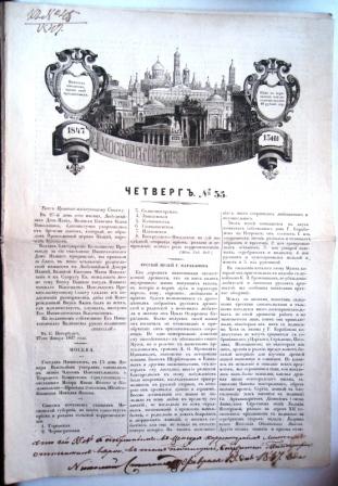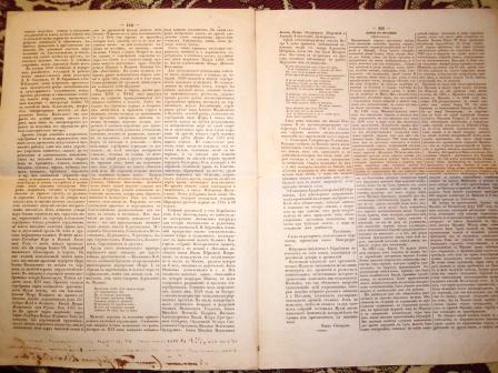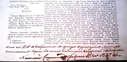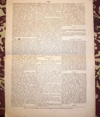 Номер газеты "Московский городской листок" за 13 февраля 1847. Состояние хорошее, внизу первой полосы надпись чернилами "Что сей 35 № с одобрением в цензуре корректурным листом отпечатан верно в том подписуюсь, содержатель типографии Николай Степанов февраля 13 дня 1847 года".