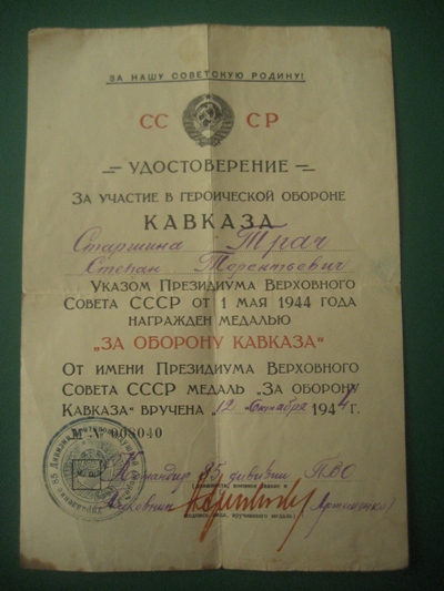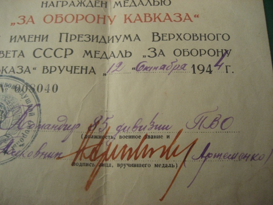 Предлагается к продаже ДОК. ""ЗА ОБОРОНУ КАВКАЗА "" Серия М 008040 вручение 12.10. 1944 г.
