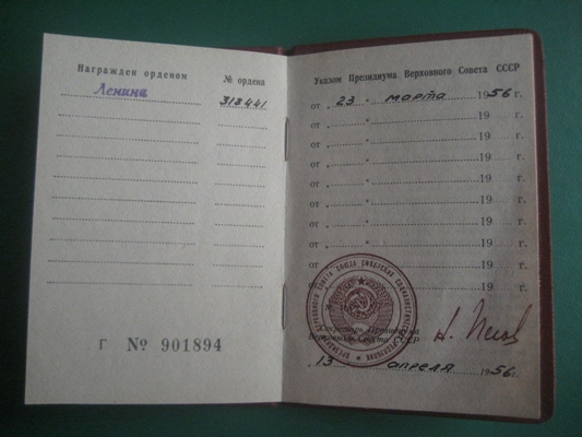 + Уд. на Ор. Ленина 1956г. Подпись Пегова.