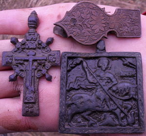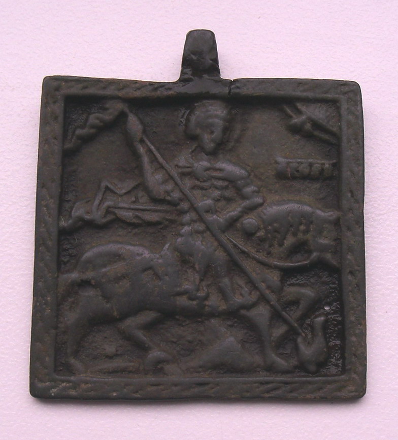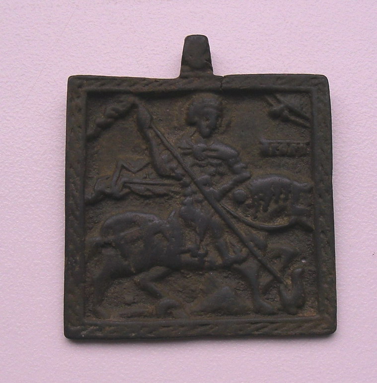 Поднял в этом сезоне данную Новгородскую плашку "Св Георгия" по стилизации датирую 16 веком. Разм 4.4 Х 4,5см. Предложите, очень редкая. Не упустите. С ув.
