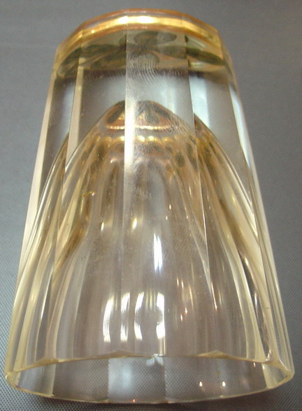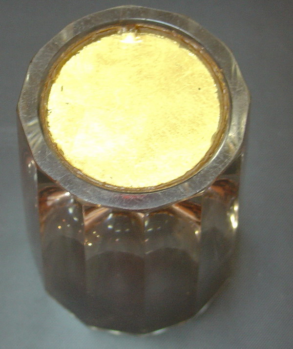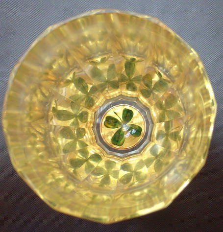 Высота 8 см. На вплавленной в стеклянное дно золотой фольге изображен четырехлистник,который преломляется в каждой из граней.