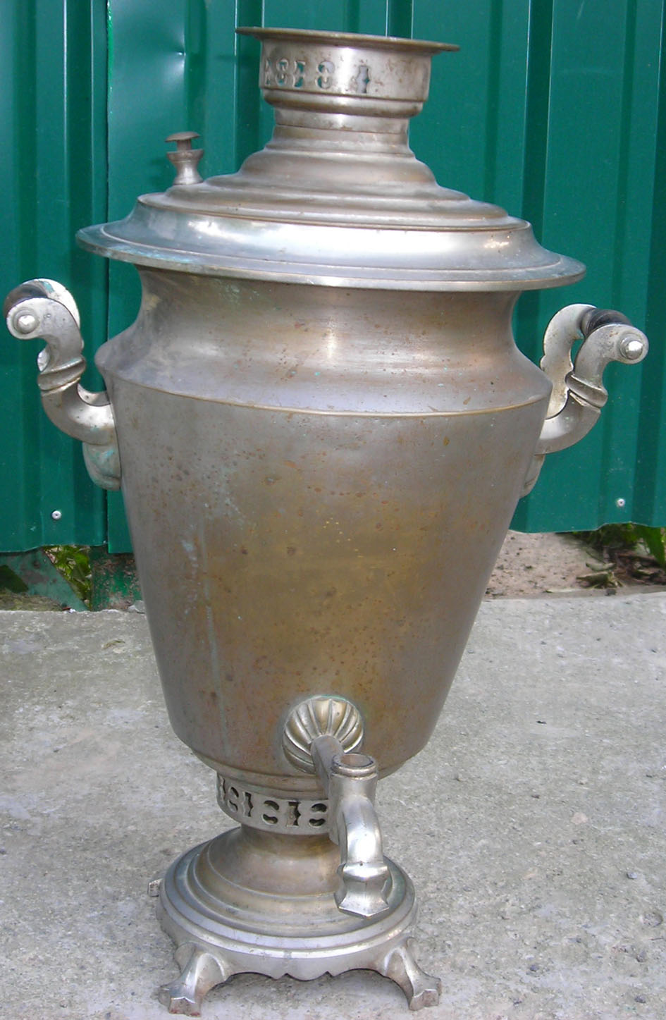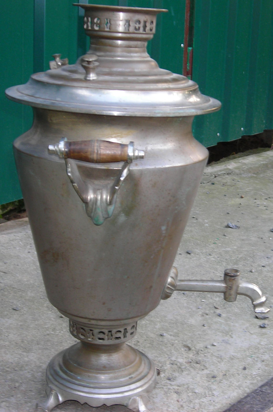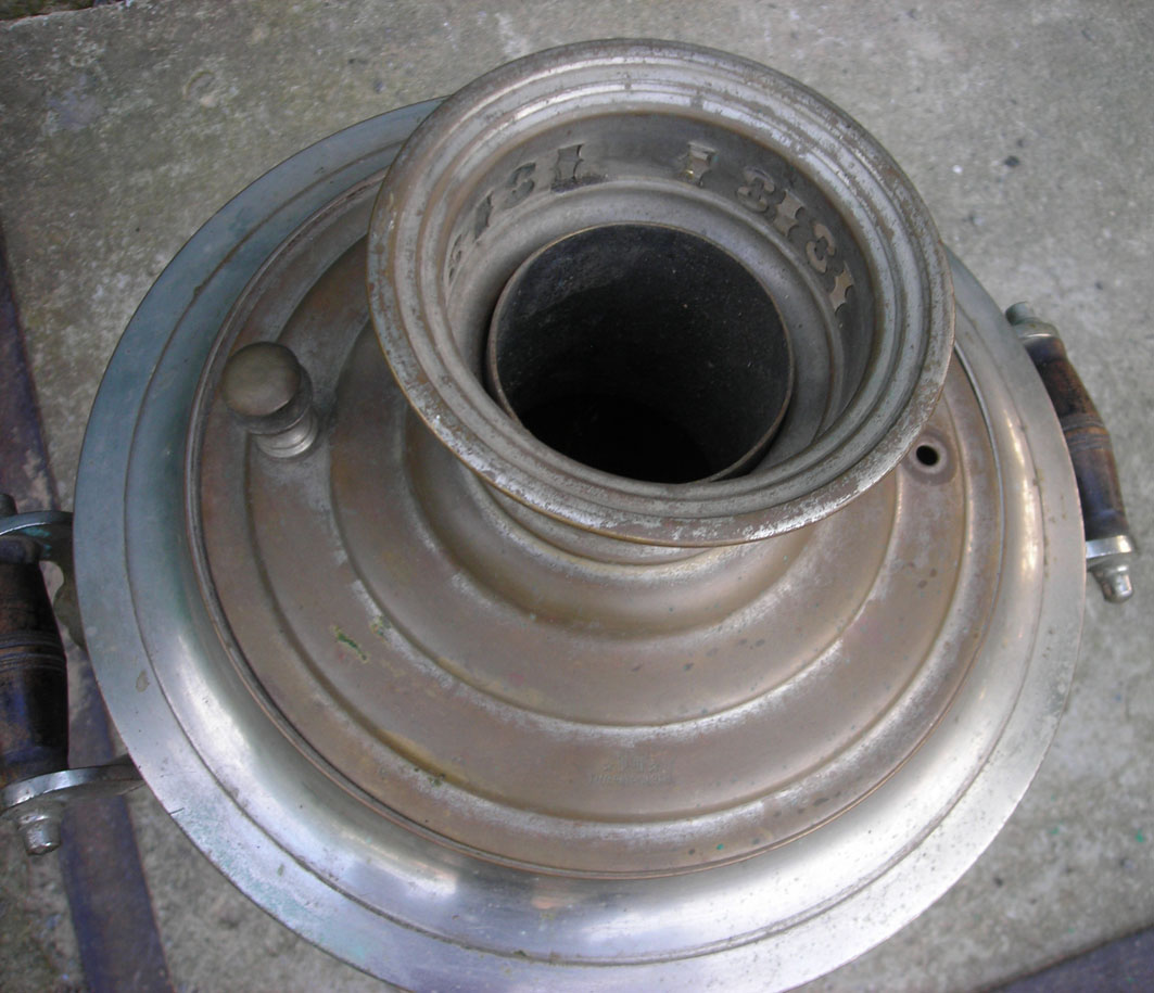 Самовар классный, смотрится так монументально... Вмещает в себя пол-ведра воды, не течёт, всё целое, без вмятин, поддувало есть, заслонка, ручки родные, краника нет. Думаю он годков 20-х... латунь . Продам срочно, мпц 150 долл.