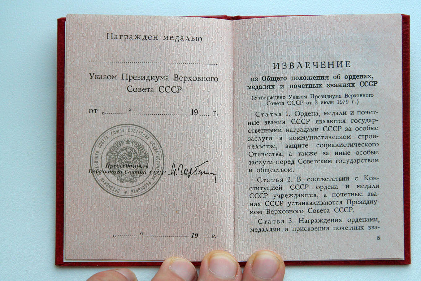 Удостоверение к медали (Горбачев), чистое! №855238