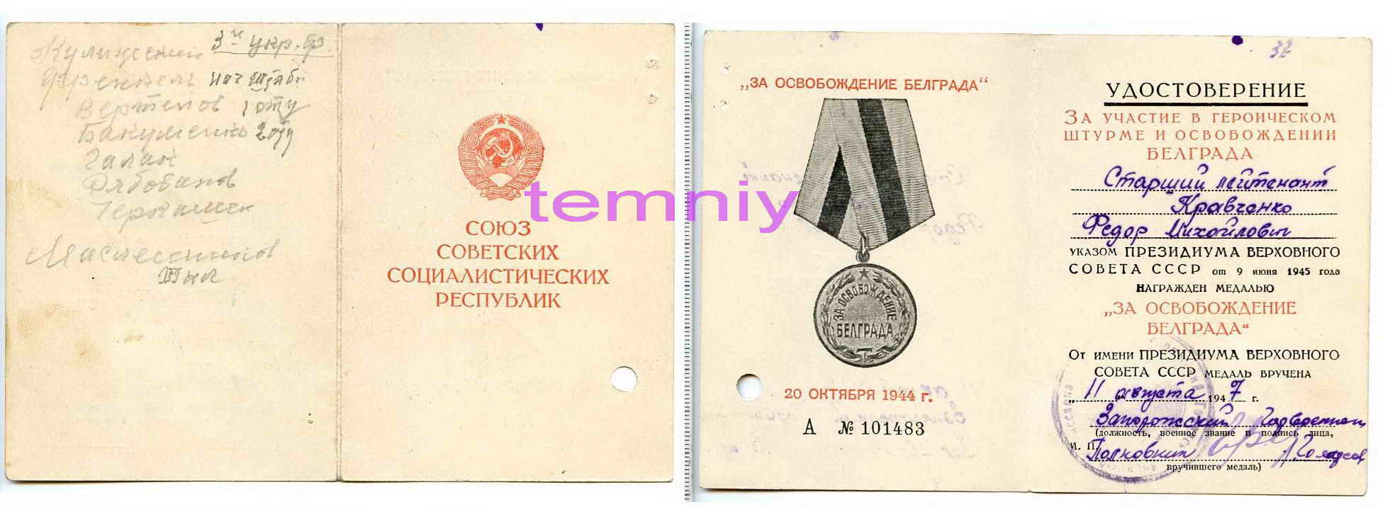 Медалей нет. Место от дырокола на доках: КЗ, Белград, ЗПНГ. Остальные доки без вмешательств(дырокола). Любые сканы по запросу. Отвечу на вопросы. СТАРТ- 100долл. БЛИЦ- 150долл. Шаг- 5долл. Есть доставка по Украине и в РФ. Расходы по доставке на покупателе: по Украине: 8/15грн., по РФ- 5долл. При БЛИЦЕ доставка моя.