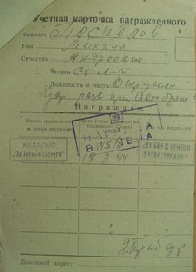 Начинал войну младшим политруком партизанского отряда, КЗ 25*** получена за партизанские засады и рейды в тыл. КЗ 25***легко пробивается здесь http://www.podvignaroda.mil.ru/).
