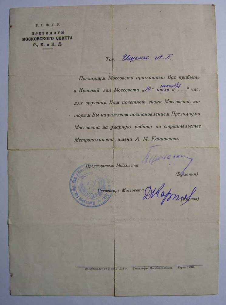 Удостоверение к знаку метро Кагановича -МПЦ-100у.е.