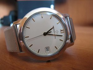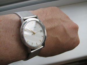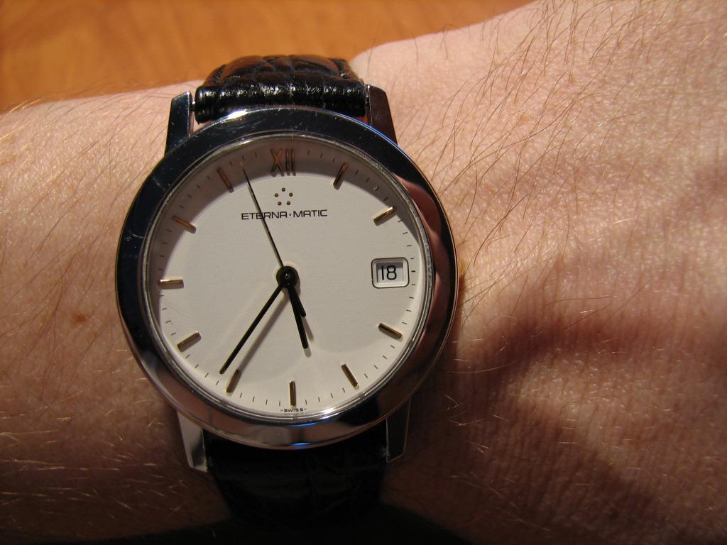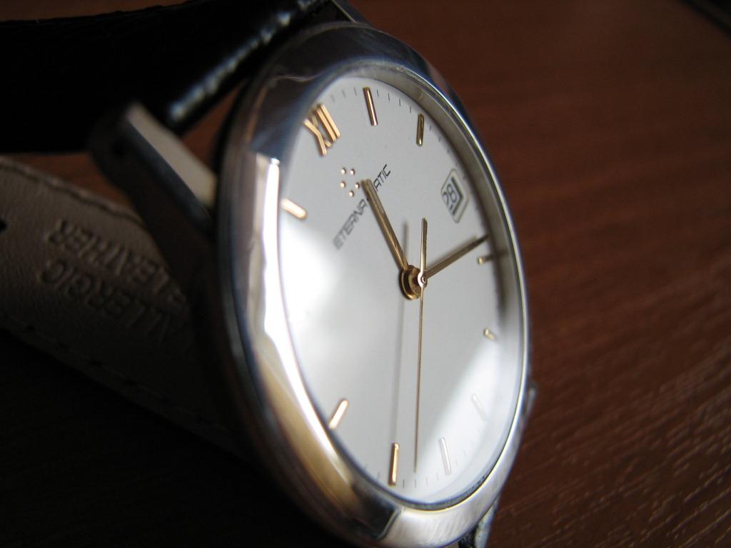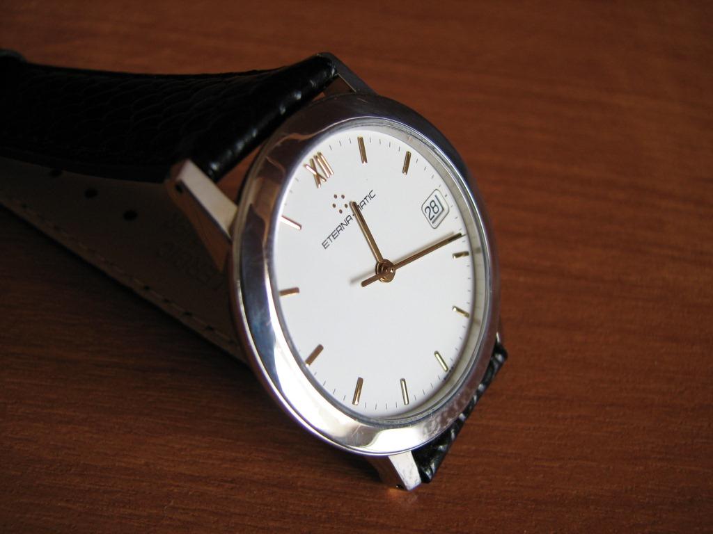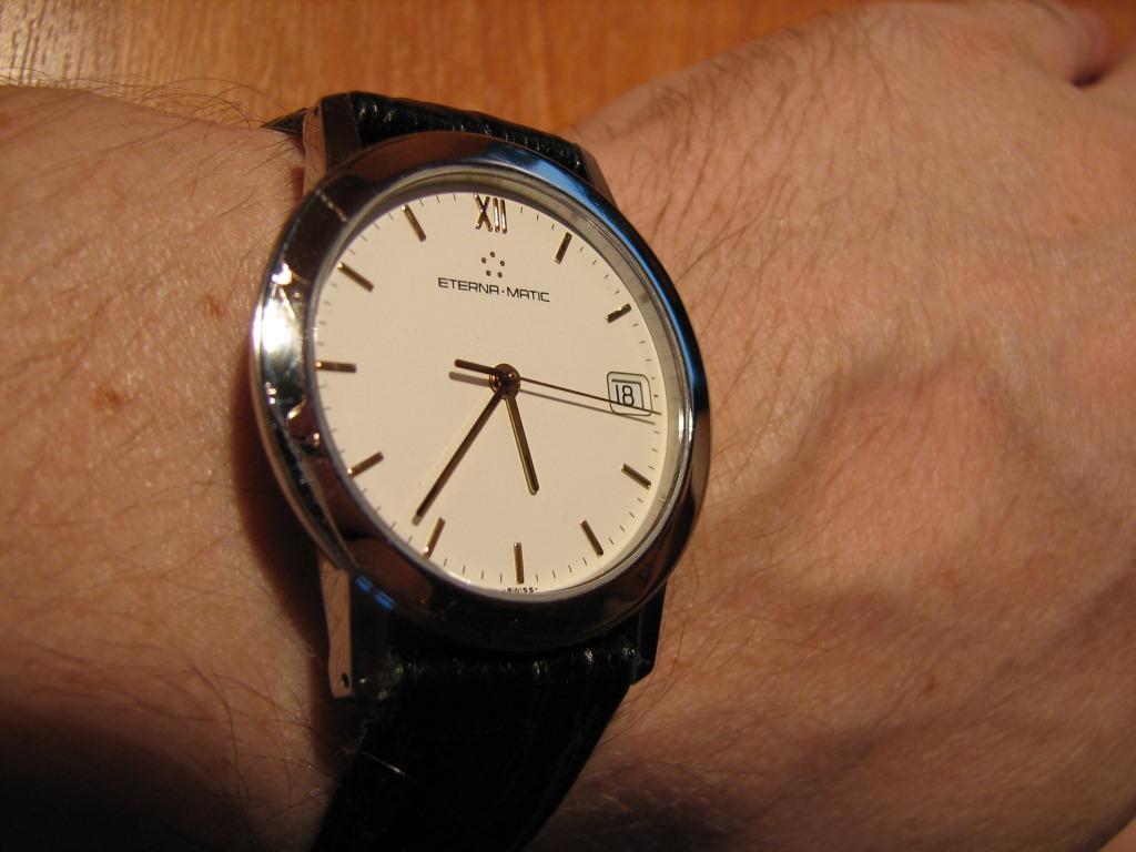 Продаются часы Eterna-matic 3400.41 . Корпус сталь, на стальном плетеном браслете. Были выпущены в начале 90х годов. Механизм автоматический ЕТА-2892-2 . Заводная головка не оригинальная, но подобрана идентичная по форме и цвету. Диаметр корпуса 34 мм, расстояние между дужками 18 мм. Браслет регулируется на руку любого размера. В комплекте только часы – коробки и документов нет.