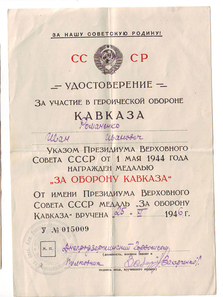 1. За оборону Кавказа - 25.11.1946 г.