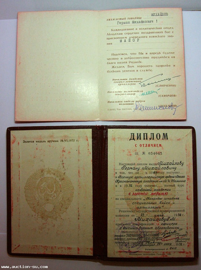 Диплом с отличием и с золотой медалью, военная артиллерийская краснознаменная академия
