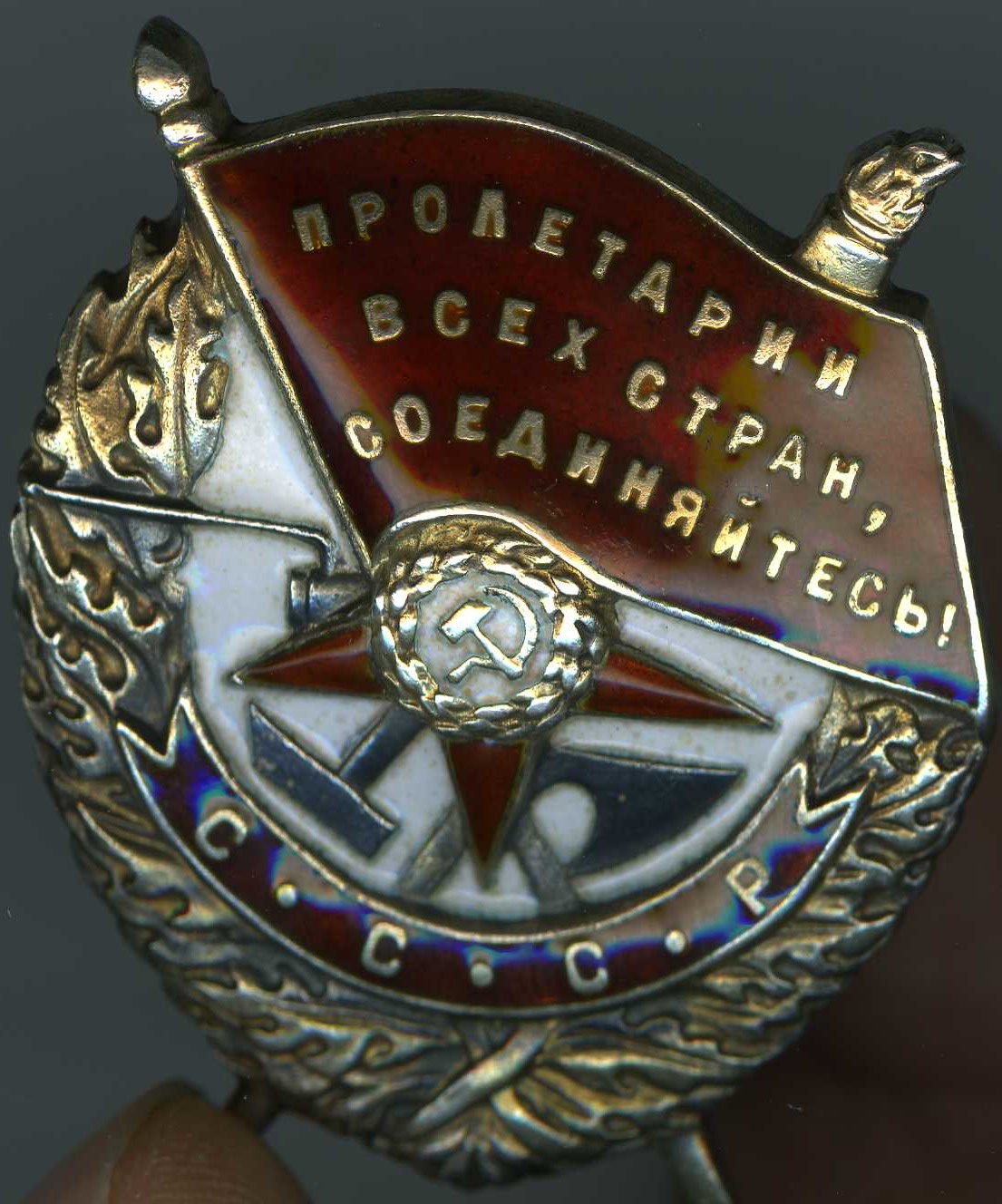 Слишком отличается эмаль по цвету на лучах и знамени,да и кромка эмаль-металл не внушает доверия,эмаль на старую не похожа.