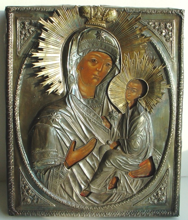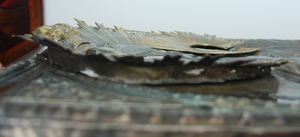 Размер 27х22 см. Надрыв на верхнем торце оклада- попытка скорого поиска фамильных драгоценностей бывших владельцев.