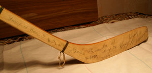 Соседка принесла клюшку своей сестры (я с ней учился в одном классе),которая была членом молодежной сборной по баскетболу и трагически разбилась при посадке ТУ-144 в Праге в 1973 году (тогда погибла вся сборная).Так вот ,эта баскетболистка была в декабре 1972 года на сборах на одной и той же спортивной базе,что и наши хоккеисты сборной СССР.