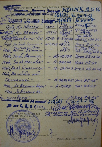 За время воинской службы награждён четырмя орденами Красной звезды, орденами отечественной войны обеих степеней, орденом Боевого красного знамени, медалями Партизану ОВ-1, БЗ, за оборону Москвы\Ленинграда\Сталинграда, за взятие Кёнигсберга и Берлина, ПнГ...