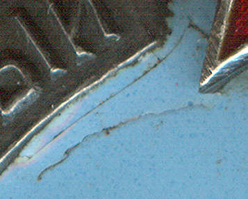 Царапины на голубой эмали, чешуйки на красной.