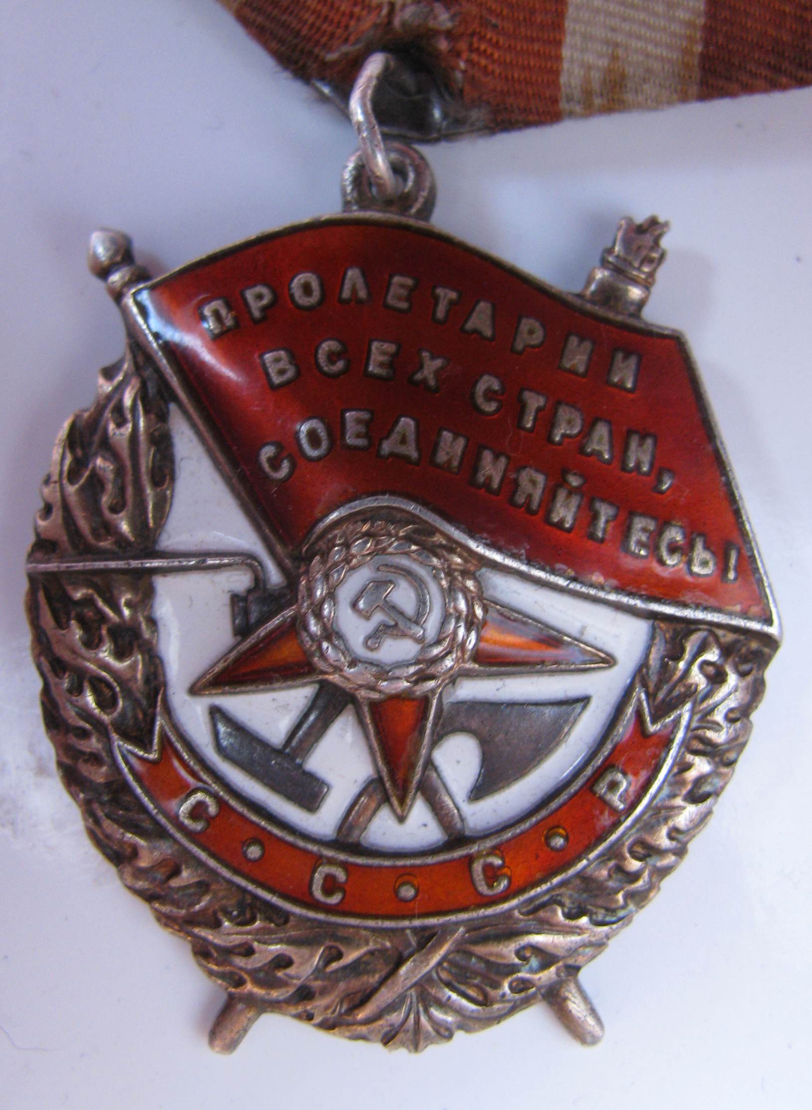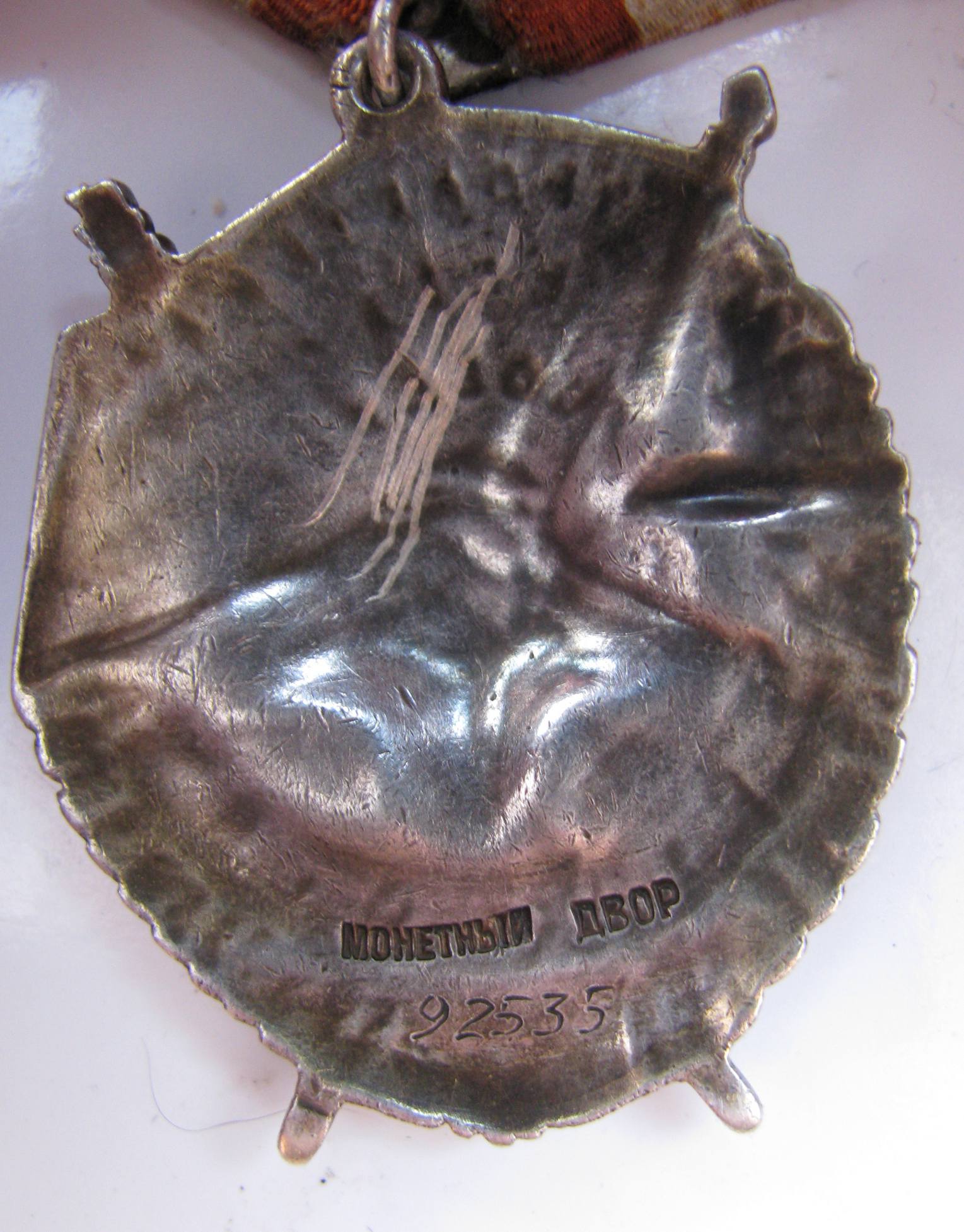 Вариант 2. Ордена второго варианта изготавливались на КМД. Реверс ордена рельефный, имеет складки и неровности, повторяющие очертания лицевой части. Клеймо монетного двора расположено горизонтально в одну строку. Каждое слово клейма нанесено отдельным пуансоном. Слово МОНЕТНЫЙ имеет выраженную кривизну и в зависимости от характера изгиба этого слова можно выделить две разновидности второго варианта. На реверсе многих экземпляров встречаются технологичексие клейма в виде одиночных цифр или букв. Минимальный известный номер ордена – 84259, максимальный – 136812.Разновидность 1. Слово МОНЕТНЫЙ изогнуто "впадинкой", буквы в слове МОНЕТНЫЙ чуть меньше по размеру, чем в слове ДВОР. Знаки первой разновидности встечаются в номерном интервале 84.000 - 119.000.