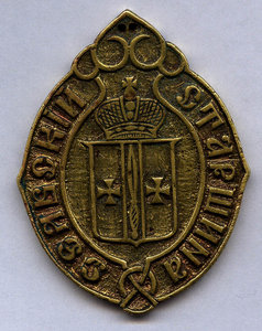 Елизаветпольская губерния. Утвержден 5 июля 1878 г. Описание герба: "В черном щите золотой столб, обремененный червленым, с черной рукояткою и с серебряными украшениями, кинжалом и сопровождаемый двумя серебряными Георгиевскими крестами. Щит увенчан Императорскою короною и окружен золотыми дубовыми листьями, соединенными Андреевскою лентою".
