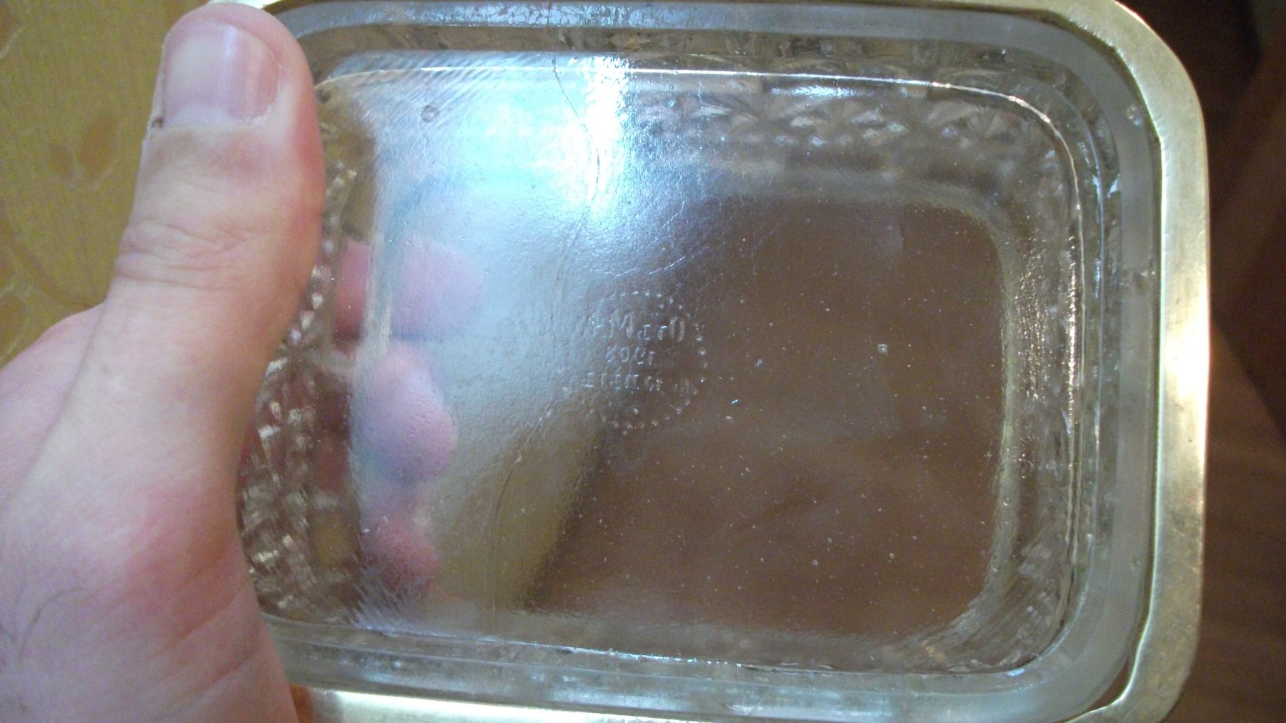 Была произведена професиональная реставрация стекла на дне и по краям.Осталась тоненькая полосочка еле видимая.