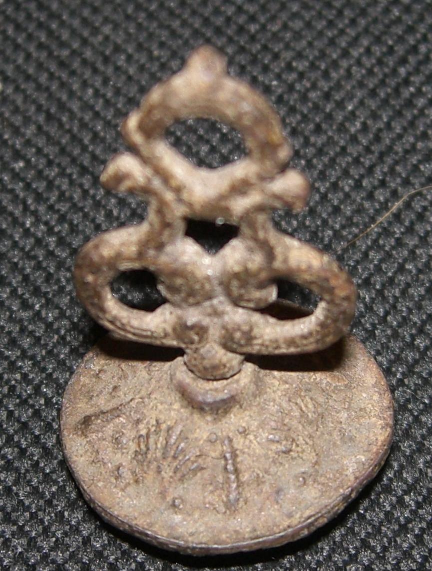Стекло, 18-й век. Массовое производство на различном стекле и в различных вариациях, подражающих геральдике. Лично у меня точно такая же есть и на стекле такого же цвета. Только ручки нет. Характерно для подобного вида печатей - очень хрупкая спайка ручки с матрицей. Из двух десятков подобных с различными сюжетами у меня только три с сохранившимися ручками. Именно этим эта мне и интересна. 40 баксей.