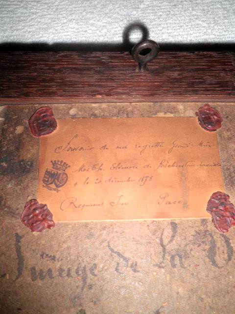 С уверенностью можно сказать, что в верхней и нижней частях иконы на обратной стороне имеется надписи (Старо-франц.яз) и печати (Герб) -"Память о моей покойной бабушке М.-Т. Элеонор де Бьеберштейн-Лавадзки, умершей 20 декабря 1878 года.