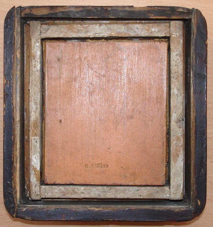 Икона в киоте. Подписная. На обратной стороне выдавлено: "И. Козiнъ". Шпонка одна, необычной формы.