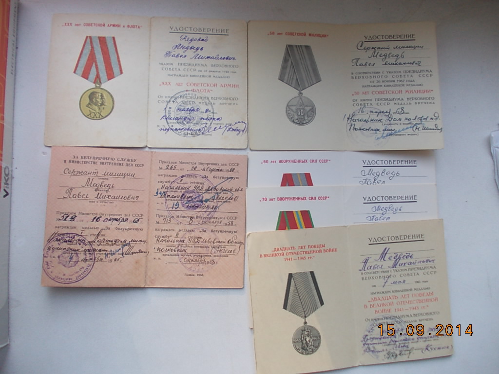 Красного Знамени, Суворова, Кутузова, Богдана Хмельницкого, Александра Невского, Ушакова, Нахимова, Отечественной Войны, Красной Звезды, Славы, За Службу Родине в ВС СССР