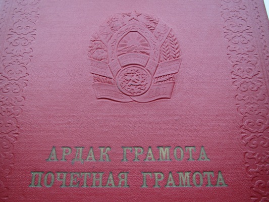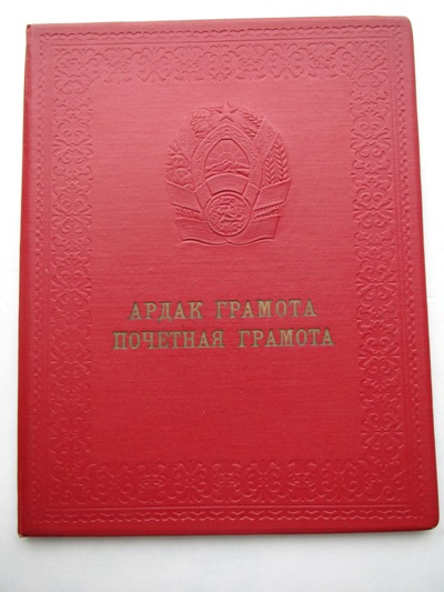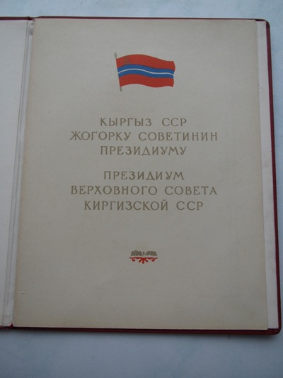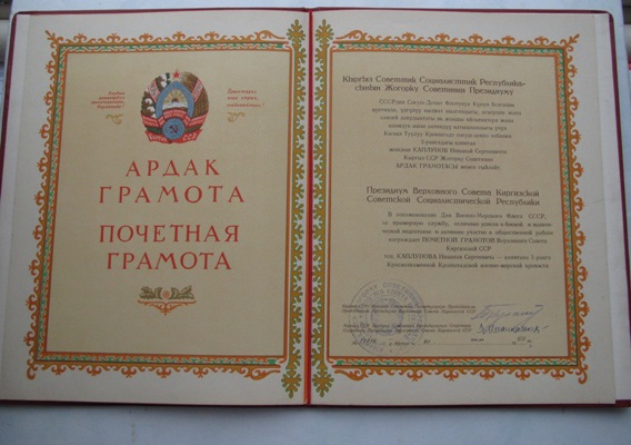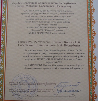 АРДАК ГРАМОТА ПВС КИРГИЗСКОЙ ССР 1960г. к-ну 3 ранга Краснознаменная Кронштадтская военно-морская крепость.