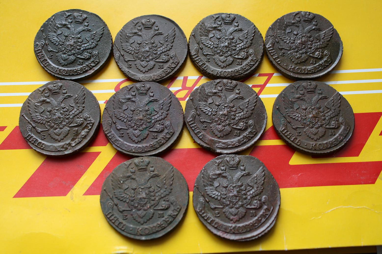 Все пятаки с одинаковой выкрошкой штемпеля. Братья-близнецы
