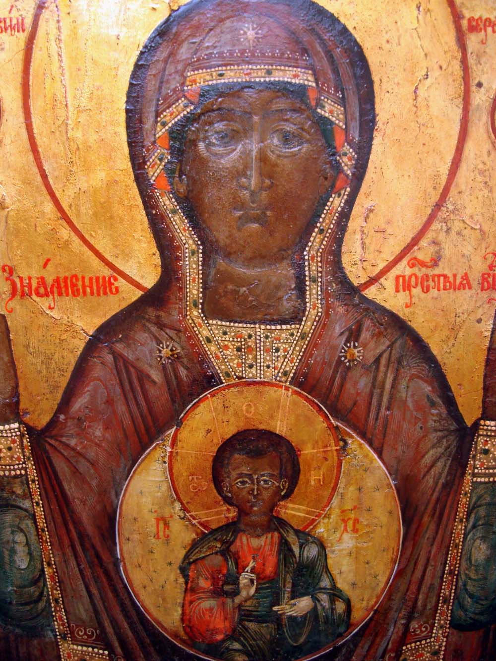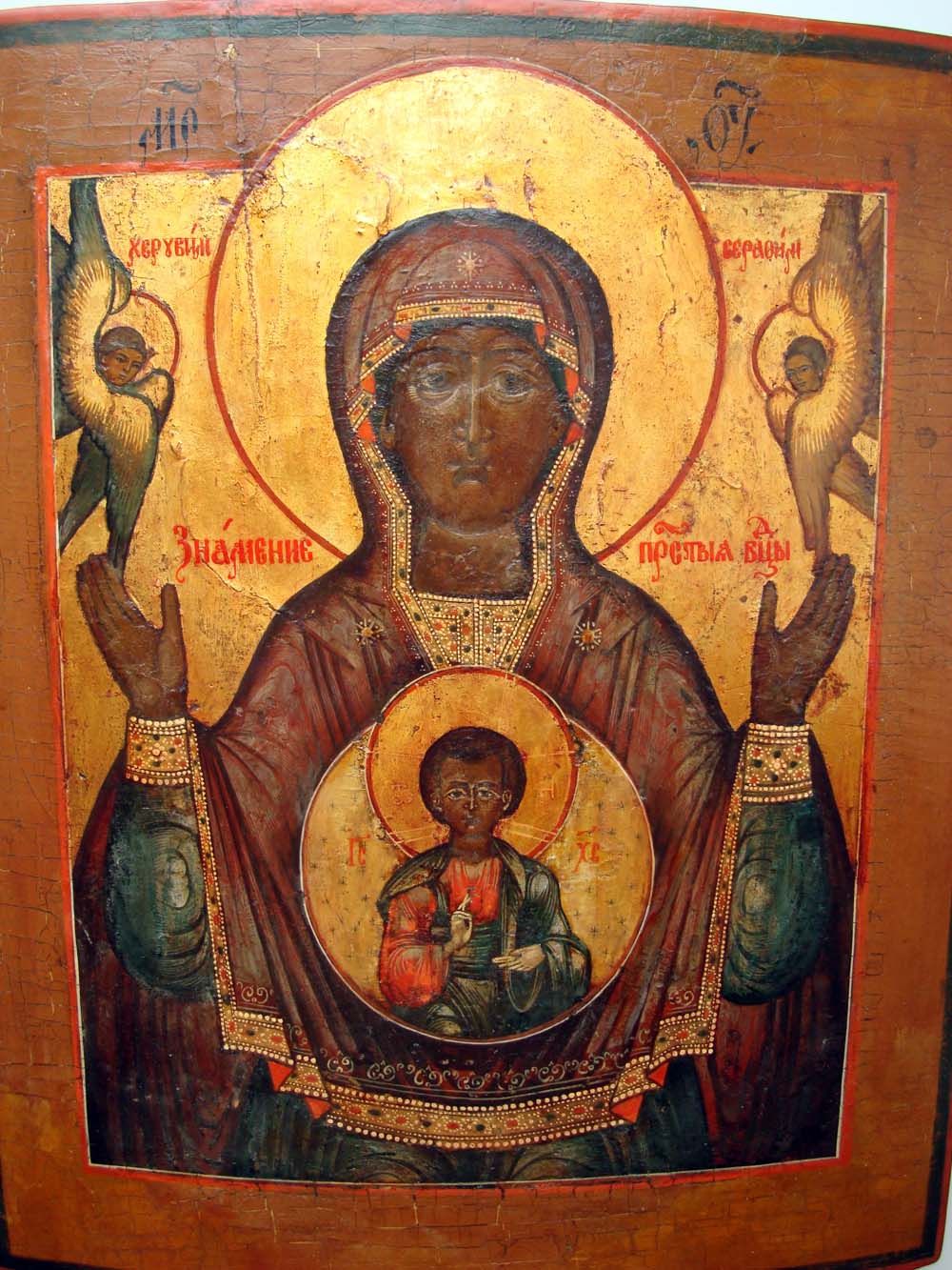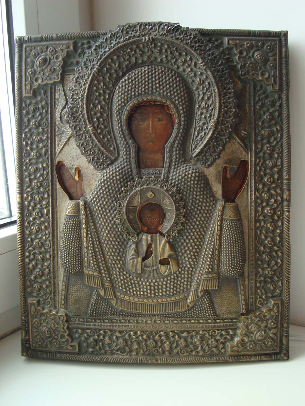 Прекрасная икона "Знамение Пресвятой Богородицы". Размер 24х29,5. Шпонки торцевые. Оклад бронзовый. Венчик не отломан, а лишь слегка загнут.