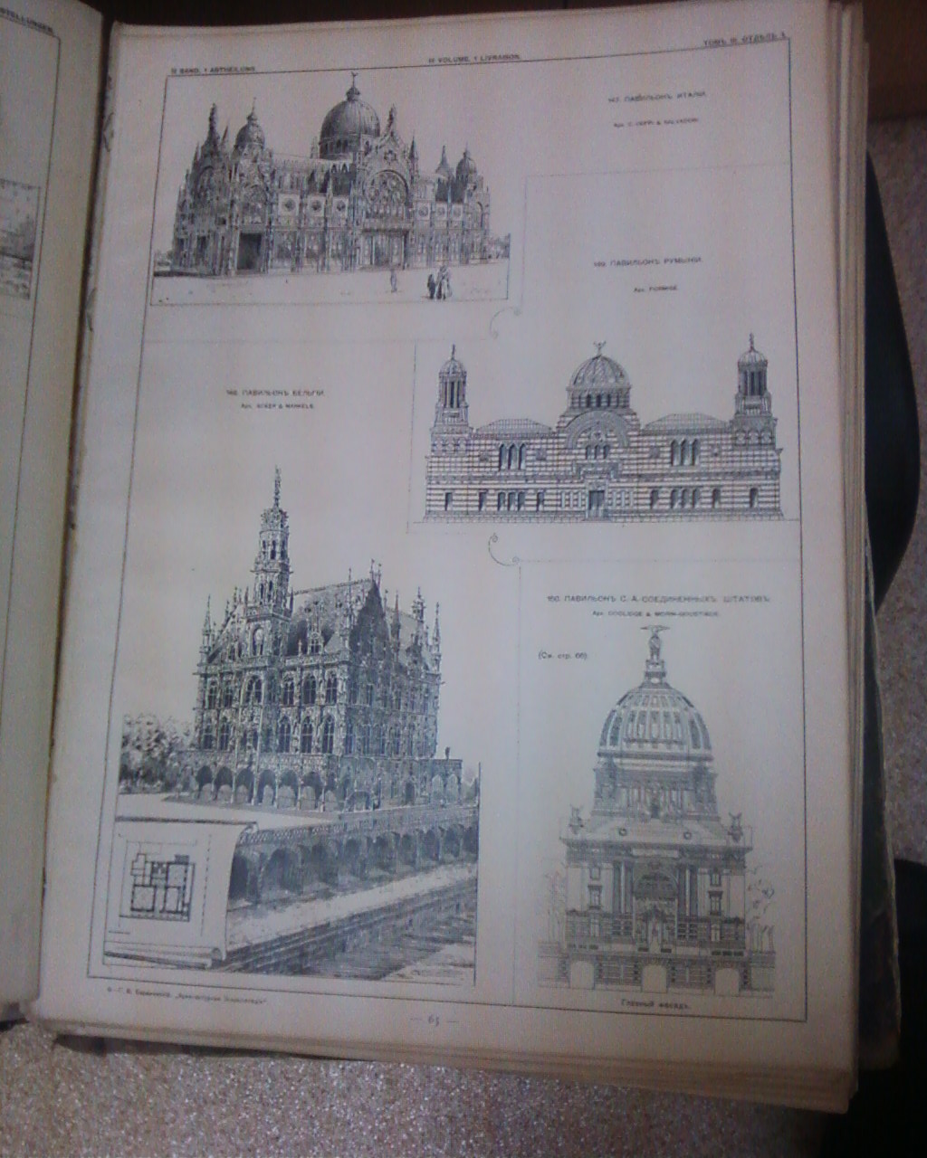 Родные (потрёпанные ) коленкоровые переплёты,все листы сохранились.Огромное количество картинок выдающихся архитектурных памятников всего мира.Книги прошли через несколько библиотек,есть штампы.