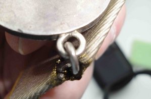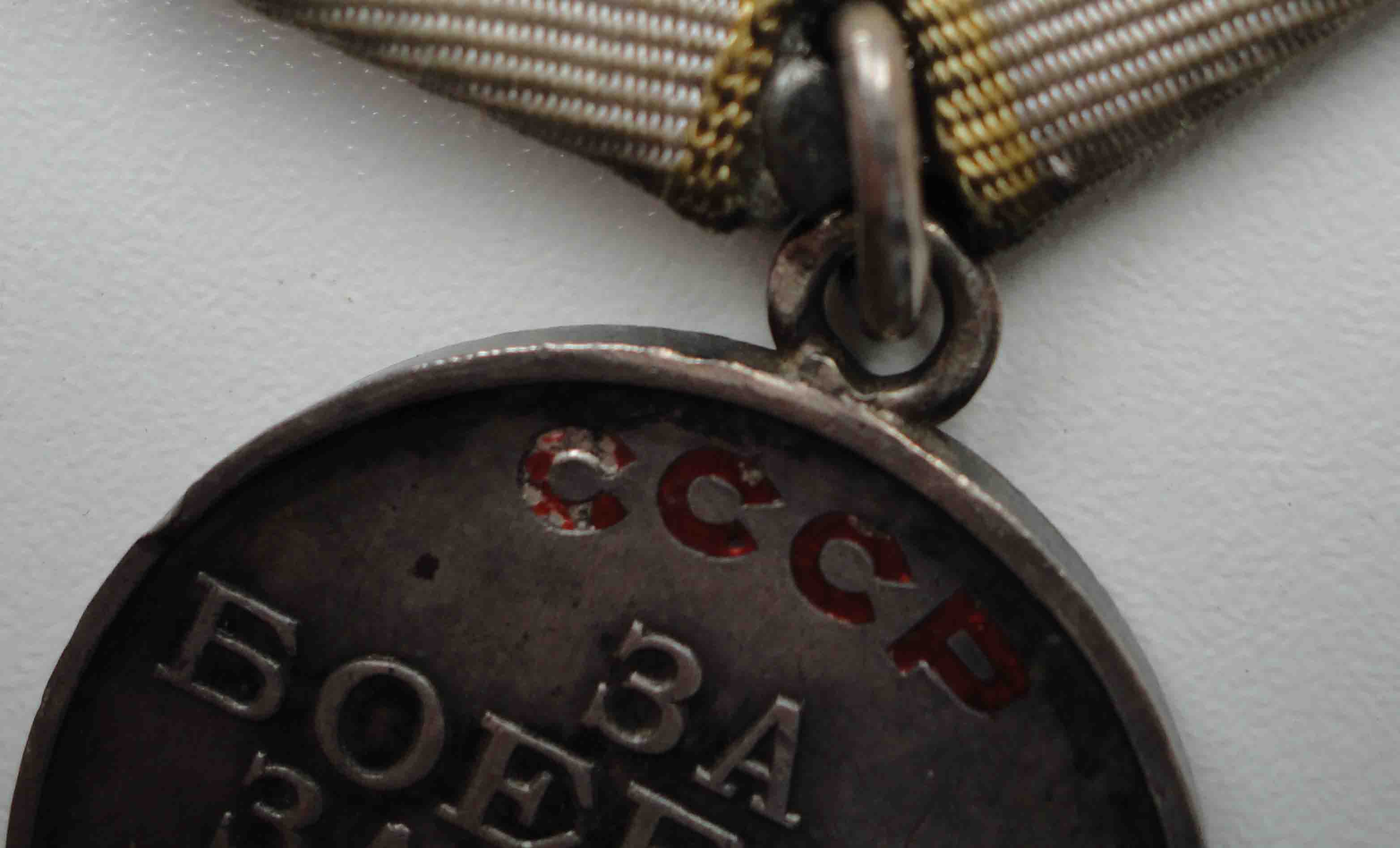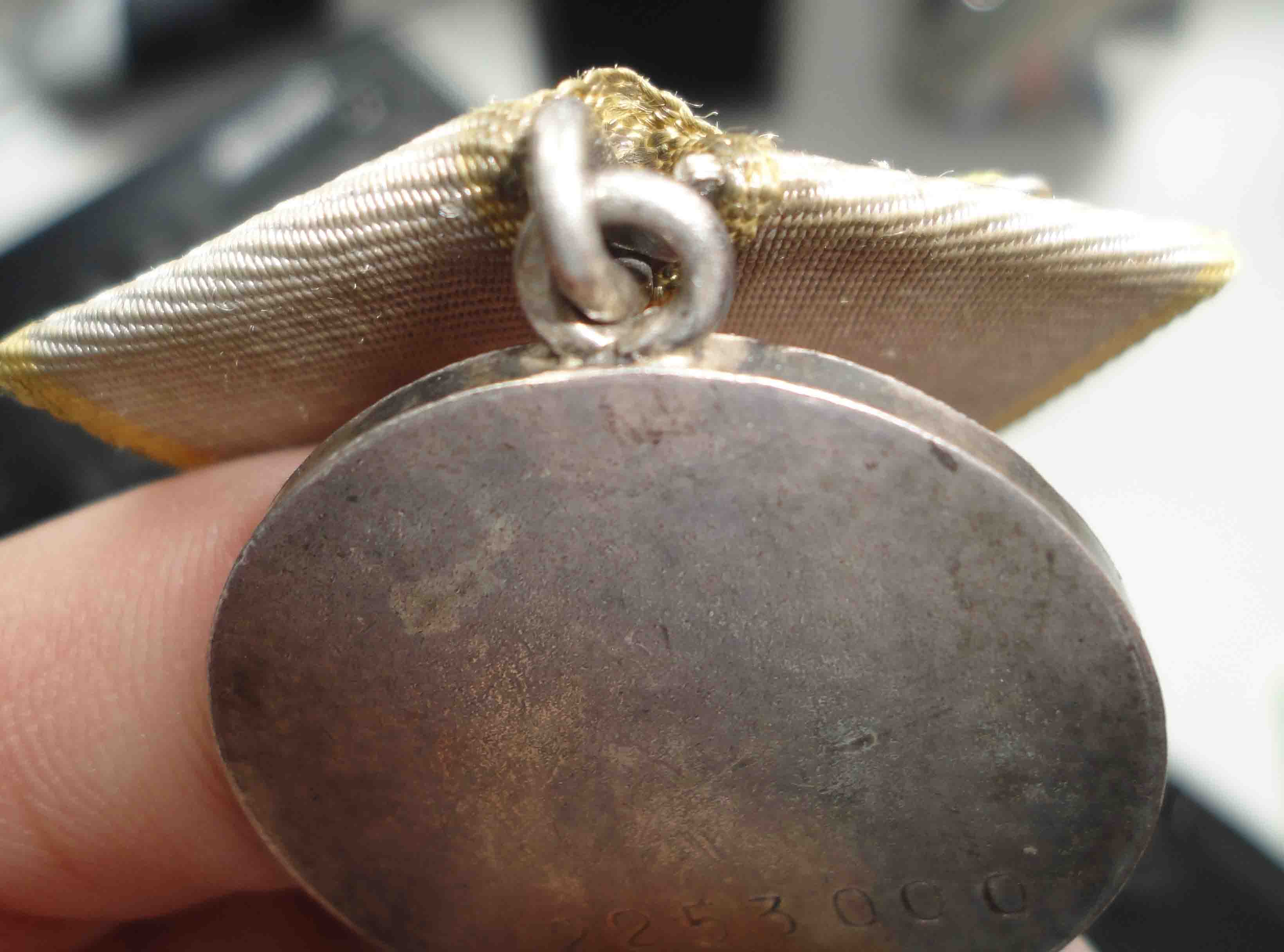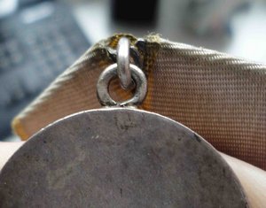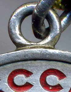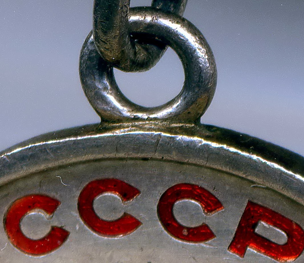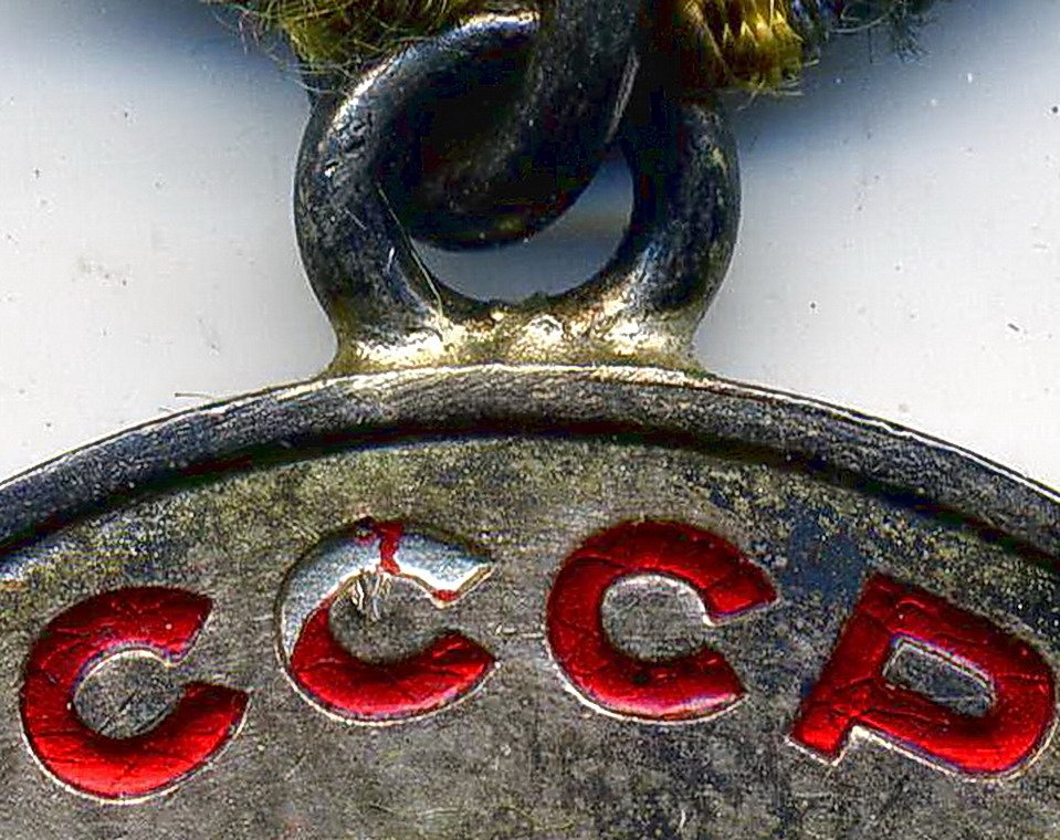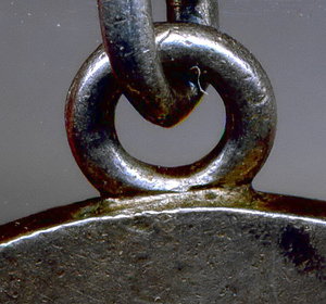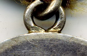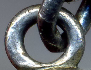 Нижняя часть ушка, соприкасающаяся с медалью, не только абсолютно гладкая изнутри (т.е. не видно, чтобы проволока стыковалась с двух концов, хотя бы даже идеально точно), но и не округлая, как проволока, а плоская! То есть, припоем так не сделаешь, хоть убейся (да и зачем бы?).