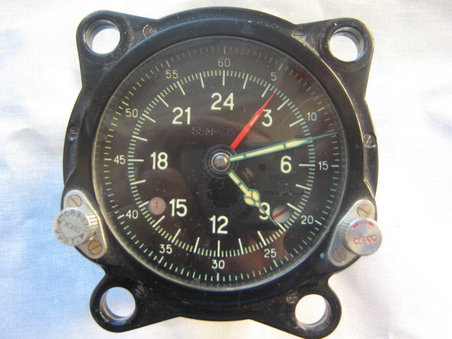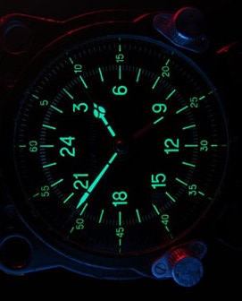 Стрелки покрыты флюоресцирующим составом, который в данном случае от подсветки светится зеленоватым светом, в более поздних моделях авиаприборов свечение красноватое.