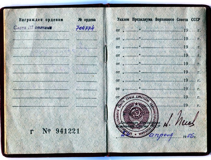Красного Знамени, Суворова, Кутузова, Богдана Хмельницкого, Александра Невского, Ушакова, Нахимова, Отечественной Войны, Красной Звезды, Славы, За Службу Родине в ВС СССР
