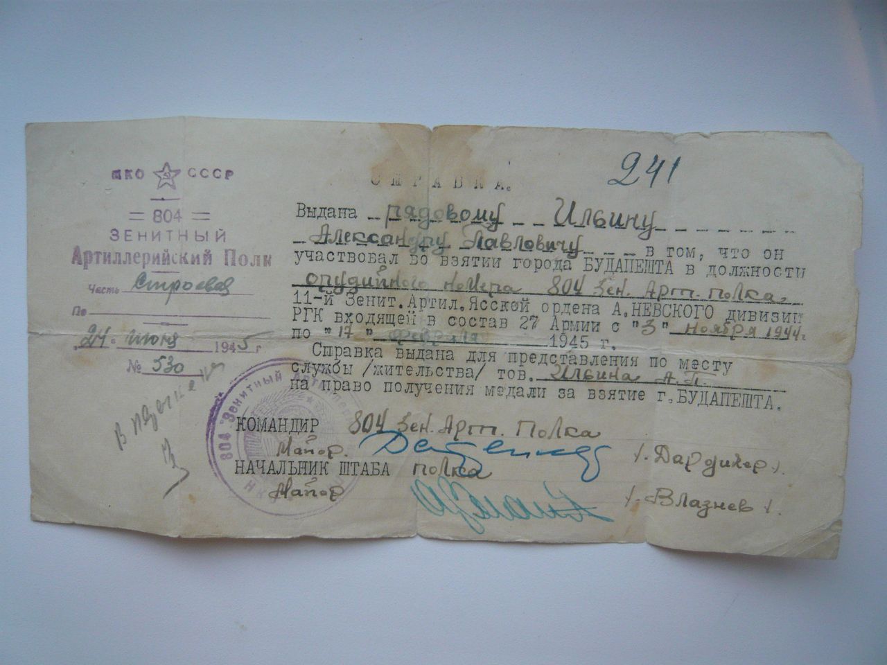 Интересная справка на медаль "За взятие Будапешта"