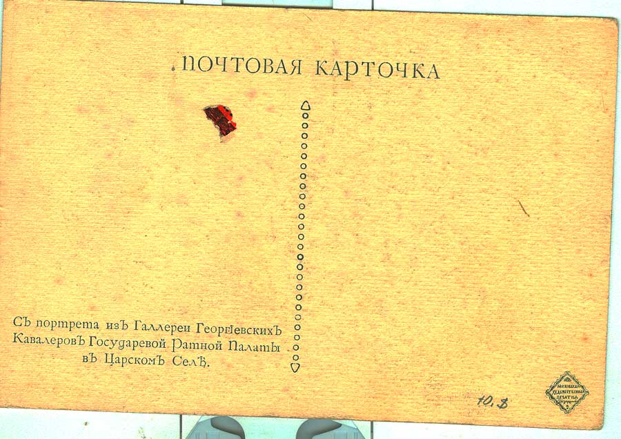 Открытка изготовлена с портрета работы Владимира Пояркова "Подпрапорщик Алексей Спиридонов Л-Гв. Гусарского полка". Портрет был выставлен в Галлереи Георгиевских Кавалеров Государевой Ратной Палаты в Царском Селе