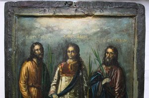 Изображены святые мученики Самон, Гурий и Авив - Хранители Домашнего Очага