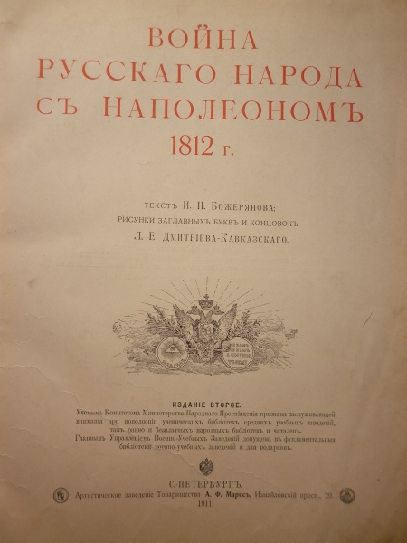 Иллюстрированное издание "Война русского народа с Наполеоном 1812г.", И.Н.Божерянов, 1911г. Размер книги 415мм на 305 мм. Много великолепных иллюстраций и исторических сведений. Если нужны дополнительные фото каких-либо страниц пишите, выложу. Предлагайте!