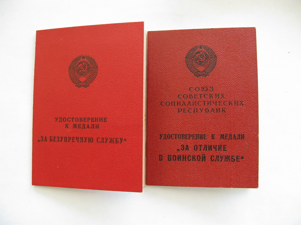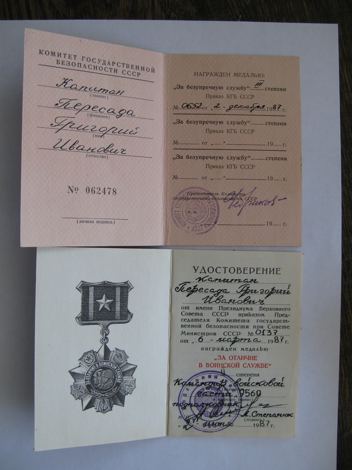 2.Удостоверение первого типа(изображение на документе медали в черно-белом варианте) на медаль "За отличие в воинской службе" второй степени на того же капитана Пересаду от 1987 года с подписью командира части и печатью войсковой части.Пересыл+5уе