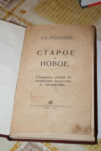 Продаётся старинная книга Д.В.Философова - "Старое и новое" (1912 г). Сборник статей по вопросам искусства и литературы. М., Издательство И.Д.Сытина, 1912 г, 308 с, твердый владельческий переплет, увеличенный формат, хорошее состояние, все страницы в наличии, дефекты - лисьи пятна на листах книги.