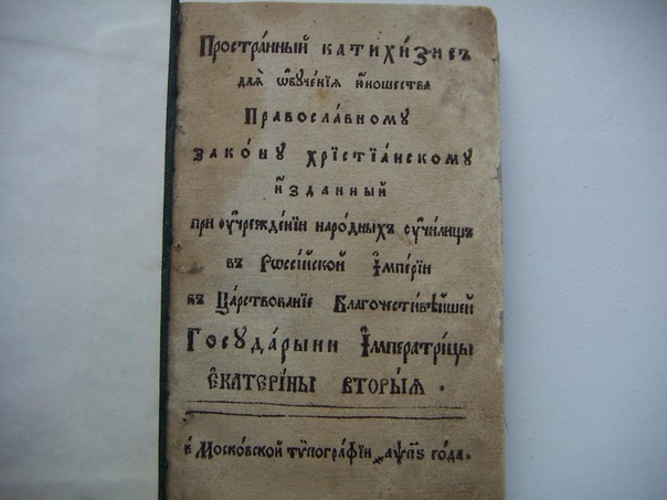 Продается старинное издание: Пространный Катехизис для обучения юношества православному закону христианскому, изданный при учреждении народных училищ в Российской Империи, в царствование Благочестивейшей Государыни Императрицы Екатерины Второй. М. : Московская типография, 1786 г. Текст на церковнославянском языке. Твердый владельческий переплёт, размер книги - 16 на 11 см.