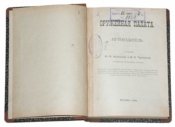 Продаётся старинная книга Оружейная палата. Путеводитель. Составили хранители Оружейной Палаты Ю. В. Арсеньев и В. К. Трутовский, хранители Оружейной палаты. Издано по распоряжению заведующего Придворной Частью в Москве Начальника Московского Дворцового Управления Генерал-Лейтенанта князя Николая Николаевича Одоевского-Маслова с разрешения Министра Императорского Двора Генерал-Адьютанта барона В. Б. Фредерикса.М., 1909. VIII, 296 c.; 18x13 см. Во владельческом составном переплете эпохи. Хорошее состояние. Латвийские печати на титуле и в тексте.