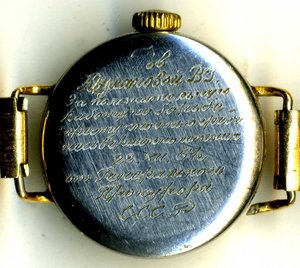 17 камней,позолота,на ходу.Надпись:"Тов. Карламовой В.Г. за положительную работу по борьбе с преступностью среди несовершеннолетних.22.ХІІ.61 г. от Генерального Прокурора СССР."