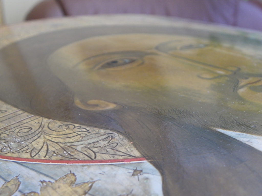 Поступило предположение в ЛС,сто Лик переписан заново,я вижу держа в руках,что это не так,когда-то давно помыл кто неграмотно,что размыты волосы вокруг Лика и вообще по Иконе местами можно это увидеть,я только попросил человека склеить доску и кроме стыка он ничего ни делал,максимум протер Икону,специально просил его об этом,чтоб не наводил волосы,вообщем чтобы не было вмешательств