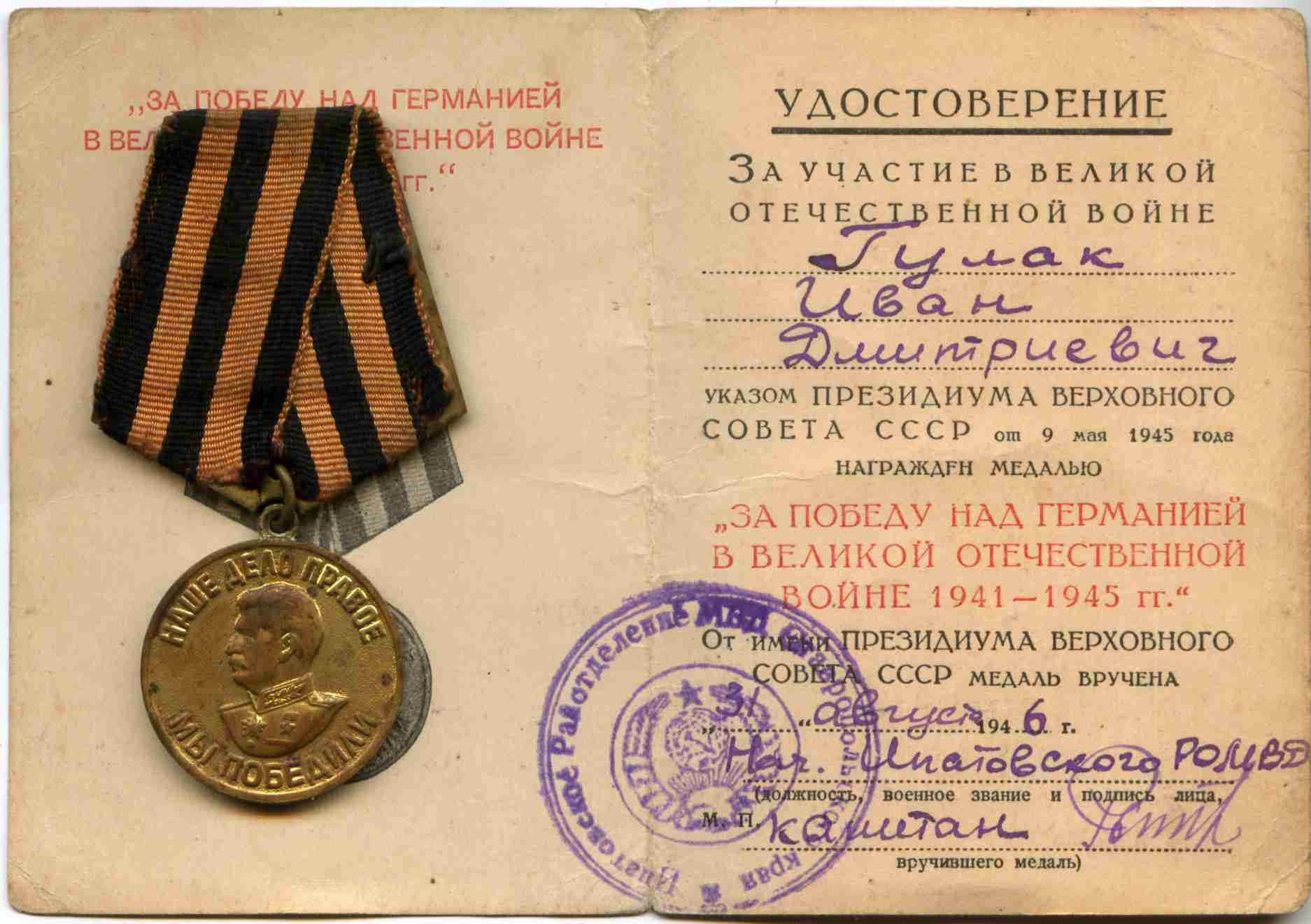 «тов. Гулак Иван Дмитр. участвовал в боях под Ачикулаком 1-го и 3-го ноября 1942 г. в качестве команд. минометного расчета. Во время танковой атаки немцев подбил немецкий танк. 3 ноября там же, во время атаки немцев автоматчиков при выходе из окружения уничтожил немецкий миномет и минометный расчет. Выходя из окружения тов. Гулак вынес с собой в часть миномет и 4 лотка мин.»