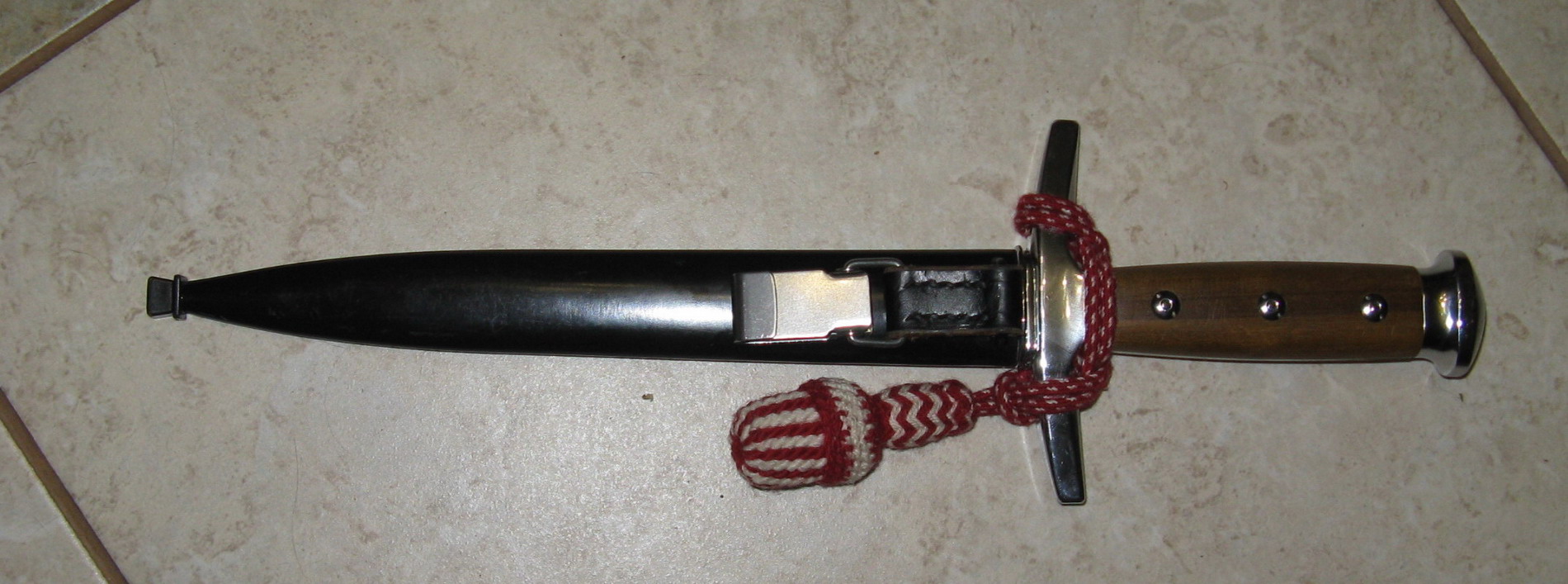 Отличное состояние. Клинок прямой двулезвийный, без долов, ромбического сечения. На пяте с одной стороны выбито клеймо: "ELSENER SCHWYZ VICTORIA", с другой стороны порядковый номер 196701. Эфес кортика состоит из рукояти и слегка выгнутой стальной крестовины. Рукоять кортика образована двумя деревянными щечками, скрепленными с хвостовиком клинка тремя винтами. Головка рукояти стальная грибовидная, овального сечения. На рукояти кортика присутствует оригинальный темляк. Все металлические части эфеса кортика хромированные. Ножны стальные окрашены в черный цвет, со скобой,к которой крепится короткий ремешок с пружинной защелкой, под скобой буква "S".