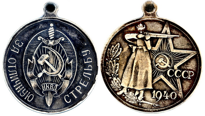Как предполагает Андрей, ведомственная медаль НКВД СССР «За отличную стрельбу» была отчеканена в 1940 году или для победителей каких-то очередных крупных соревнований лучших стрелков Наркомата внутренних дел или же, возможно, для награждения отличившихся в ходе только что закончившейся советско-финляндской войны снайперов войск НКВД…