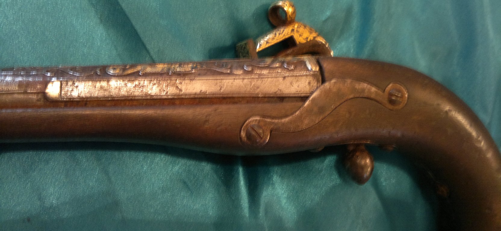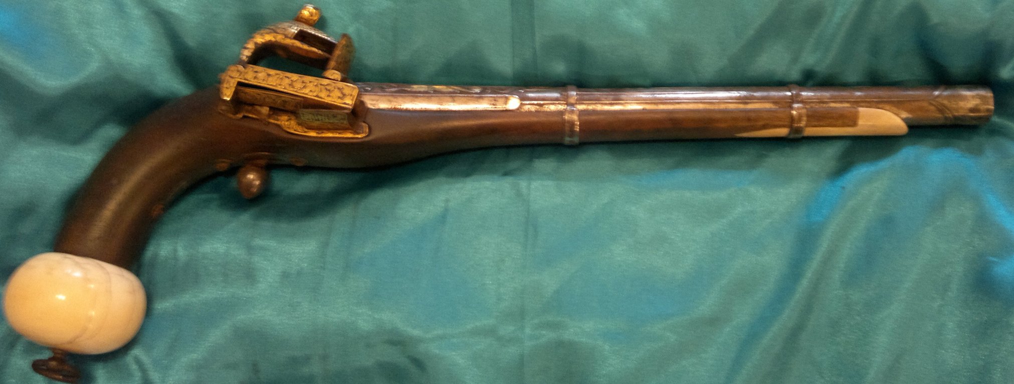 Кремневый пистолет, наболдашник на рукоятке-слоновая кость,золочение, всё родное и без вмешательств, вживую ешё краше.