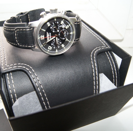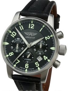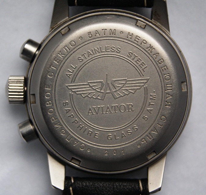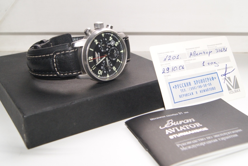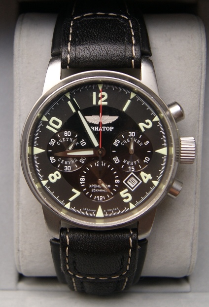 Модель в стиле традиционных авиационных часов, диаметр 41 мм., родной «Полетовский» механизм 31681 с ручным заводом, с хронографом и календарем, указателем времени суток, матовый корпус, сапфир, на стрелках суперлюминова, часы номерные.