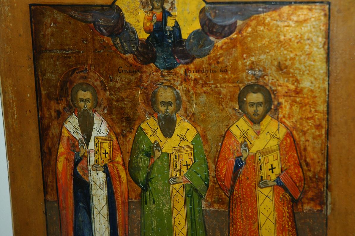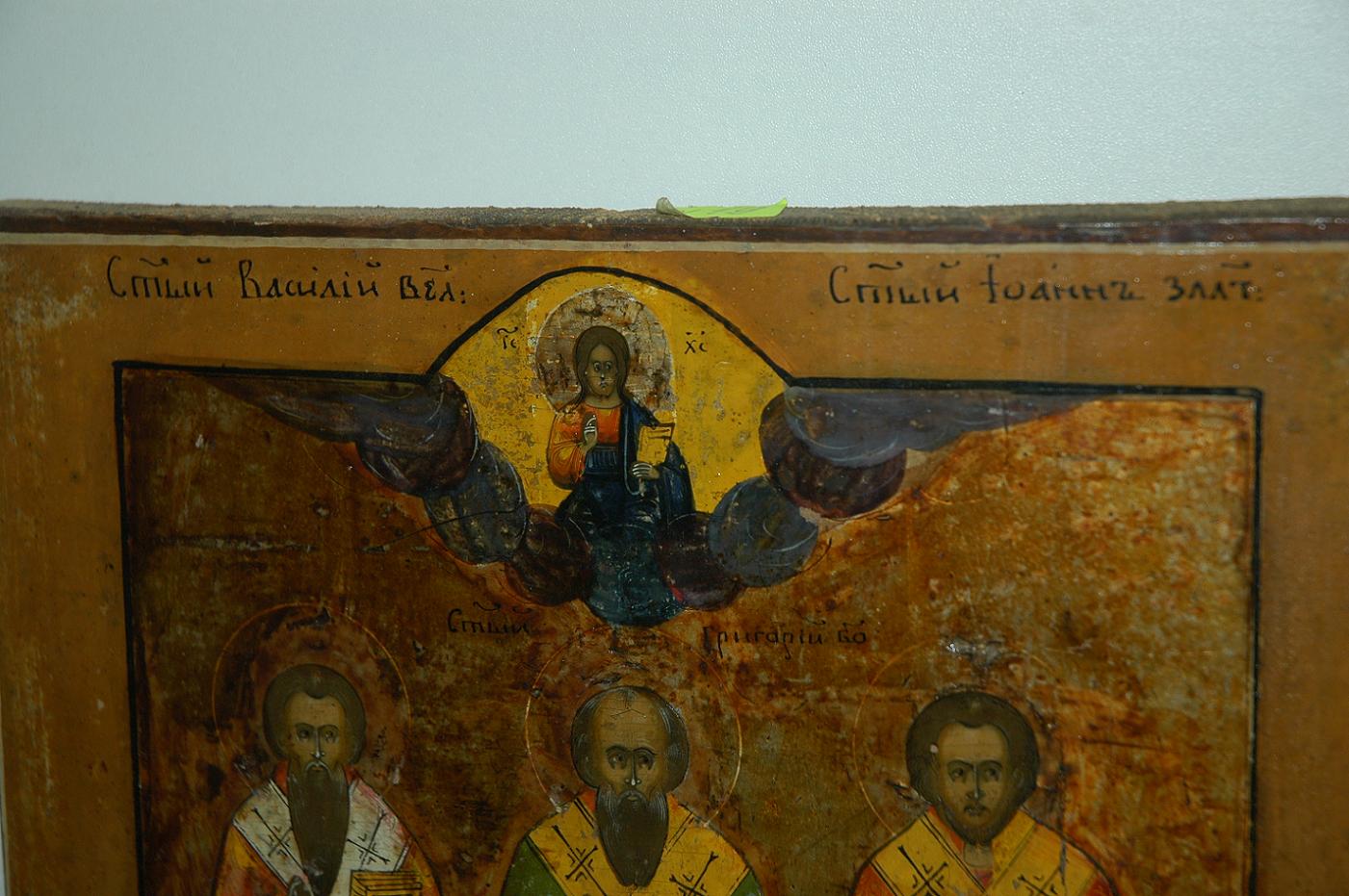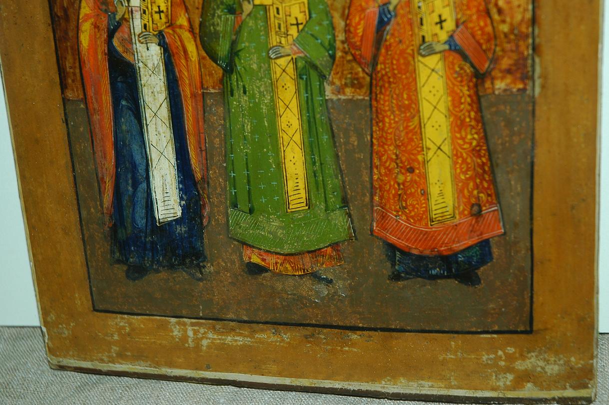 Продам икону Три Святых.разм.26х30.05 см.Состояние на фото.МПЦ 11т.руб.